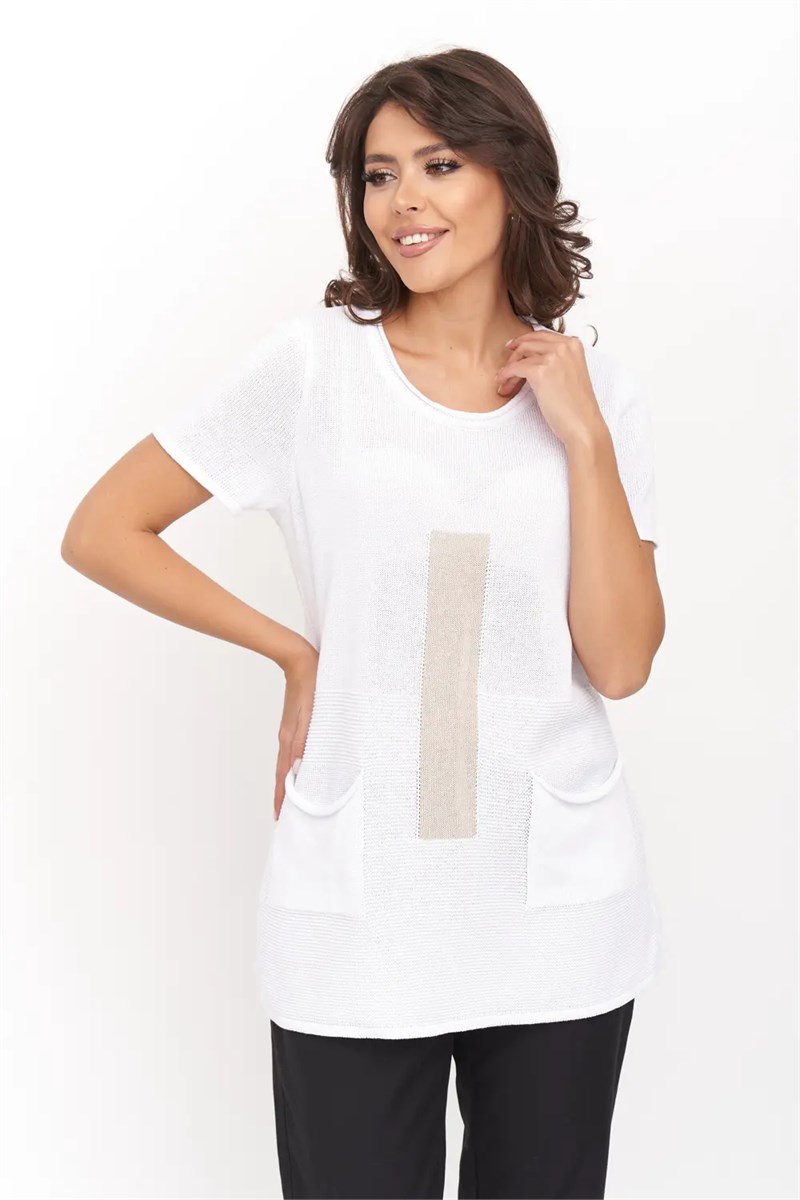 Женский трикотажный джемпер свободного силуэта. Рукав втачной короткий, вырез горловины круглый. Джемпер выполнен структурным кулирным переплетением. Два накладных вывязанных кармана.
