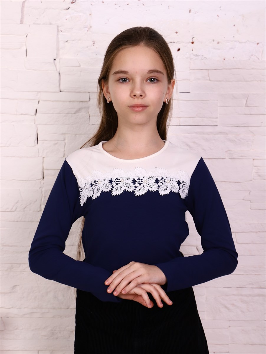 Джемпер для девочек младшего и старшего школьного возраста, из трикотажного полотна кулирка с лайкрой. Джемпер прилегающего силуэта, с втачным рукавом. Спереди кокетка. На шов притачивания кокетки к нижней части переда настрочено кружево и приклеены полубусины. На спинке отсутствуют линии членения. Рукав длинный с одним швом. Низ рукава и изделия подогнуты.