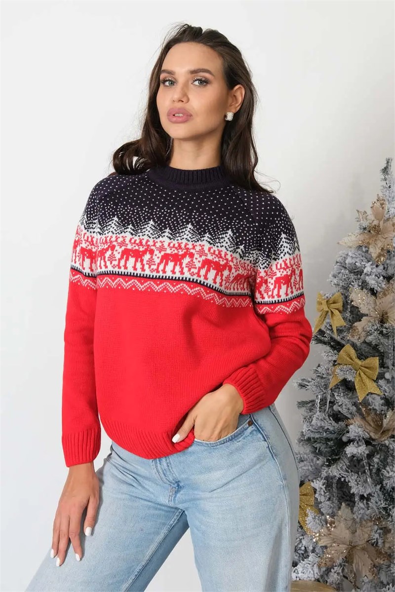 Оригинальный новогодний женский джемпер с круглой горловиной из тёплой мягкой пряжи с добавлением шерсти. Рукав втачной полной длины. Выполнен жаккардовым переплетением. Окутает вас тёплом в серые и холодные будни,придаст настроение праздника.