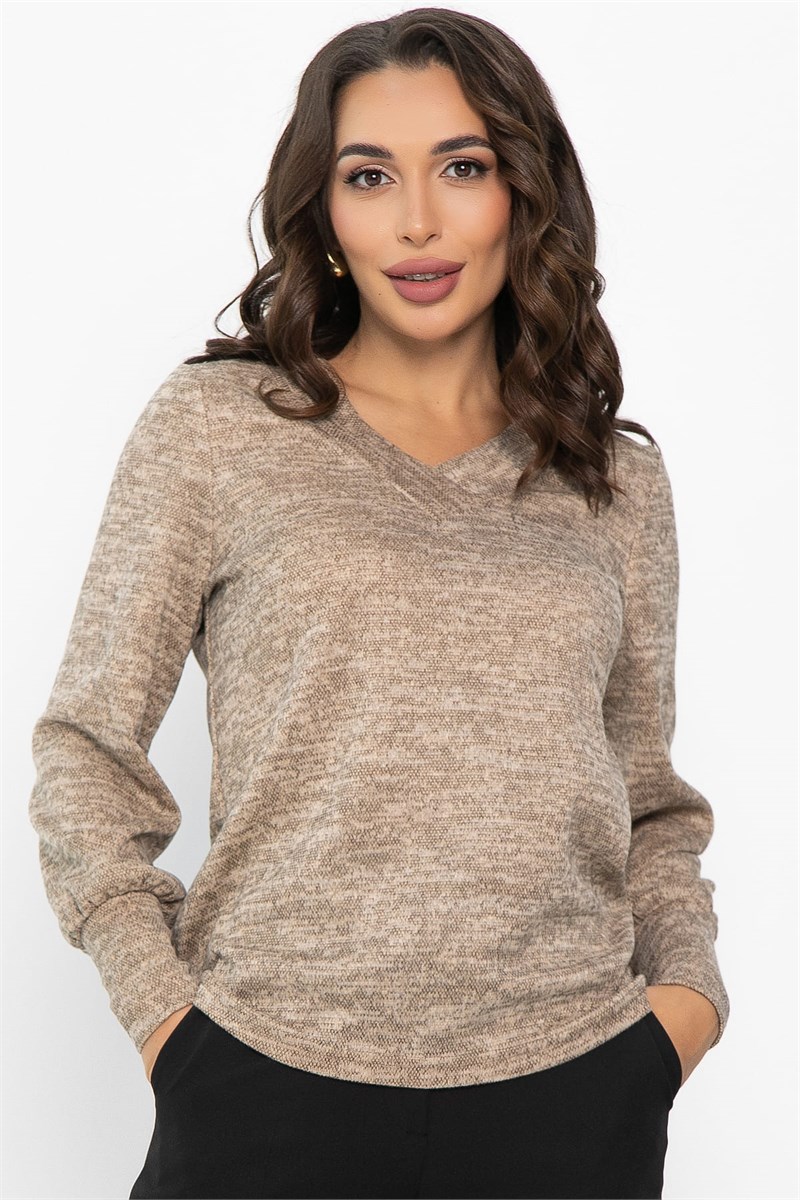 Базовый джемпер из мягкого трикотажа в песочном оттенке прекрасно подойдёт для создания повседневных образов. Длинные втачные рукава с широкими манжетами подарят комфорт в прохладное время года. Красивый V-образный вырез горловины - акцентная деталь, украшающая образ.