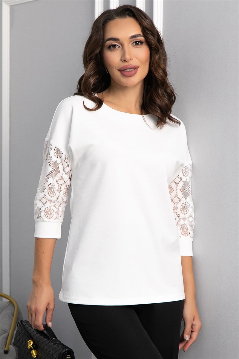 Сделайте свой образ воздушным и очаровательным с помощью нашего джемпера в молочном цвете! Нежное сочетание трикотажа и изящных кружевных вставок на рукавах создаст атмосферу романтики и женственности. Простой и лаконичный силуэт джемпера будет прекрасно сочетаться с любыми базовыми вещами из вашего гардероба. Свободный крой джемпера деликатно скроет недостатки фигуры.