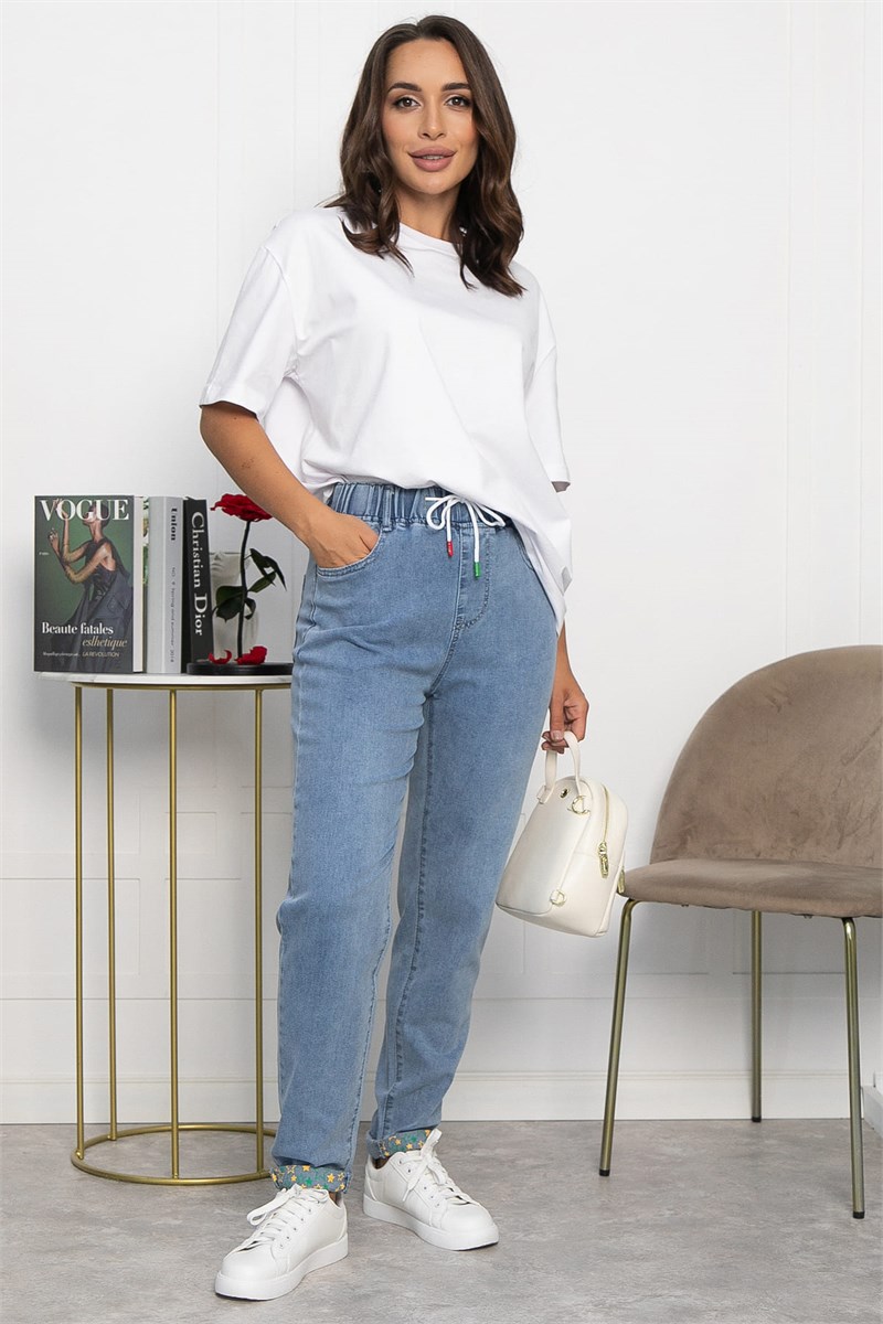 В гардеробе каждой девушки голубые джинсы будут востребованы всегда, ведь их можно считать классикой. Сочетайте с футболками, топами или с блузками, так как эти джинсы идеальны для повседневной жизни. Талия на резинке, вставлен шнурок в пояс. Низ украшен ярким принтом!