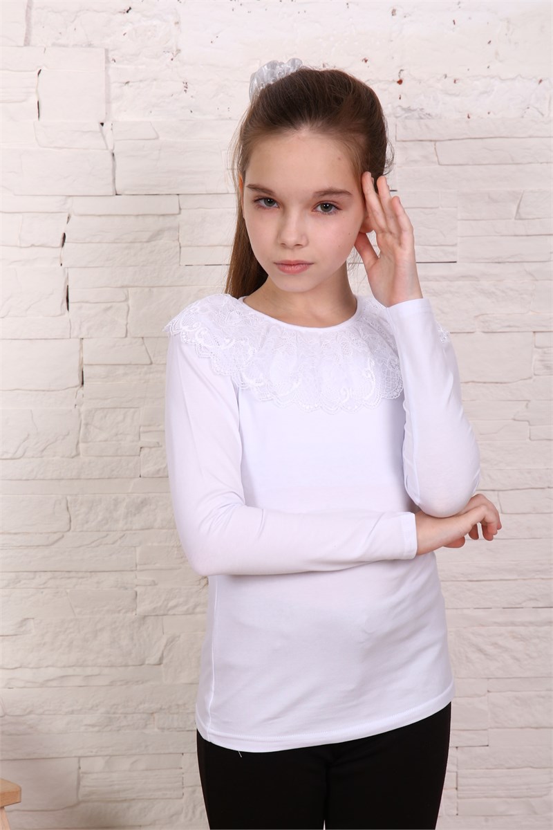 Блузка для девочек дошкольного, младшего и старшего школьного возраста, из однотонного трикотажного полотна кулирка с лайкрой. Блузка полуприлегающего силуэта, с втачным рукавом, без застежки. Спереди и на спинке отсутствуют линии членения. Срез горловины обработан узкой окантовочной лентой из того же полотна в 4 сложения, с вложением присборенного кружева. Рукав одношовный, длинный. Низ рукава без манжеты, подогнут.