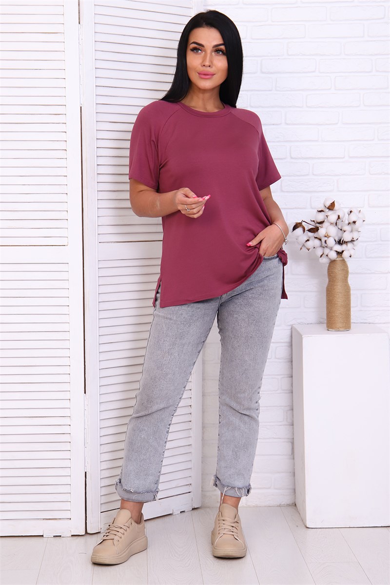 Футболка свободного силуэта имеет разрезы по бокам, рукав - реглан и круглый вырез горловины. Свободный стиль позволяет скрыть недостатки, придает шарм и уверенность. Модель будет отлично смотреться в комбинации как с джинсами, так и короткой юбкой.