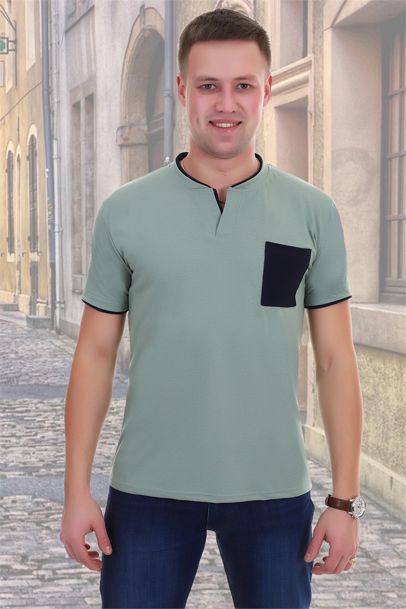 Мужская футболка из кулирки с лайкрой. Воротник-стойка с небольшим треугольным вырезом, темная окантовка горловины и рукавов, темный накладной карман на груди.