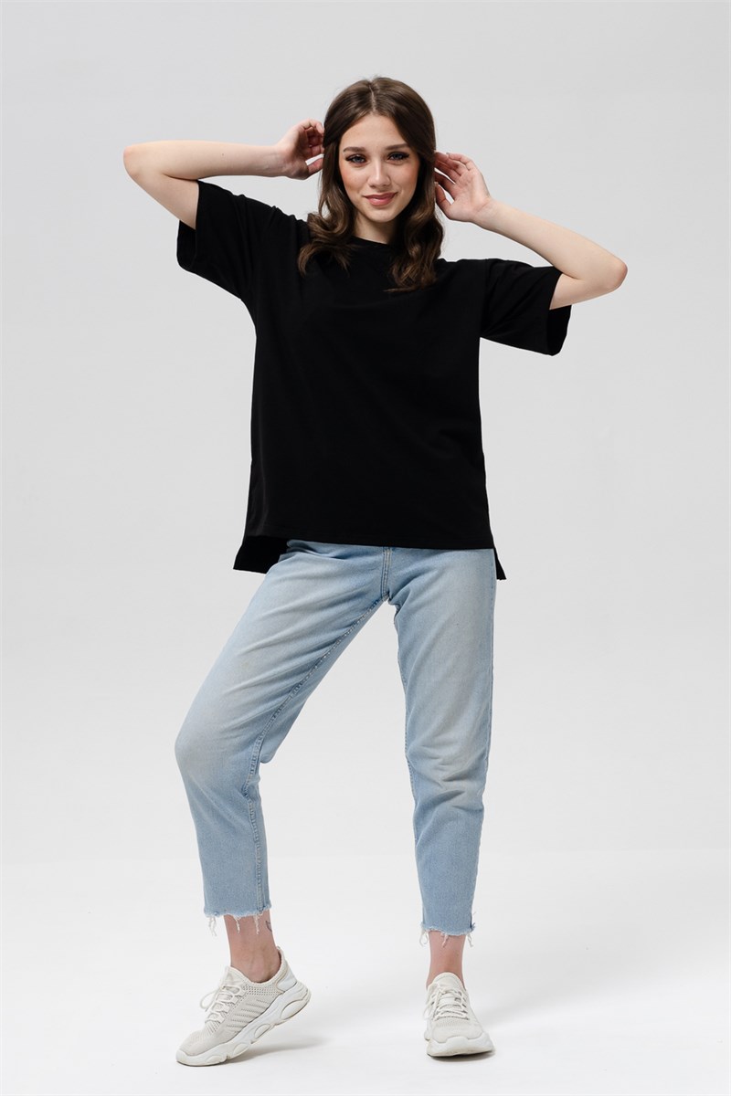 Футболка женская оверсайз свободного кроя со спущенным плечом. Модель выполнена из трикотажа, тактильно приятна к телу и не просвечивает. Футболка подходит для любого типа фигуры, так как имеет свободный крой. Свободную футболку можно сочетать с джинсами, джоггерами и юбками. Ткань футболок долгое время сохраняет свои первоначальные свойства.