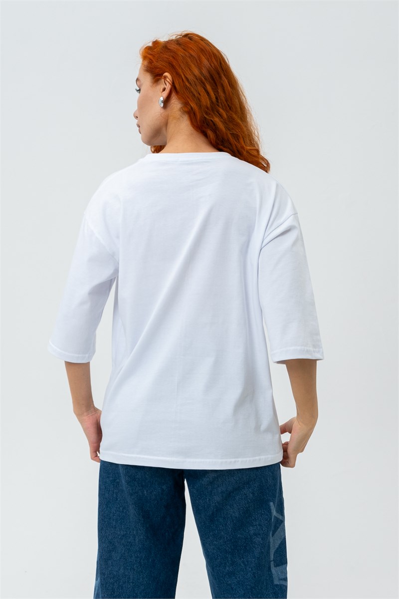 Женская футболка прямого свободного кроя, очень удобная, лёгкая и стильная. Длина рукава немного ниже локтя. Эффектно смотрится и подходит на каждый день. Изделие изготовлено из высококачественного хлопка пенье. Длина рукава указана в измерениях от точки основания шеи.