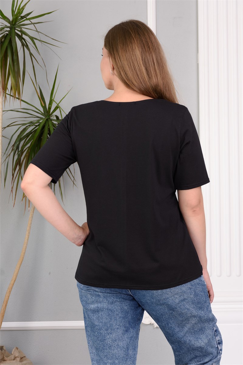 Стильная женская футболка с принтом из серебристого и золотого глиттера. Спокойные цвета ткани. Горловина обработана двойным кантом. Рукава и низ изделия подогнуты.