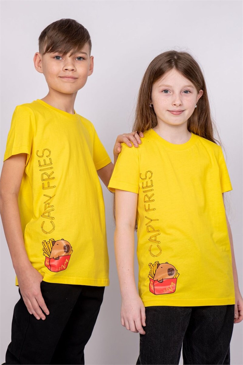Футболка детская прямого силуэта с втачным коротким рукавом. Горловина обработана рибаной. Росток спинки обработан бейкой из кулирки. На полочке принт ШЕЛКОГРАФИЯ
