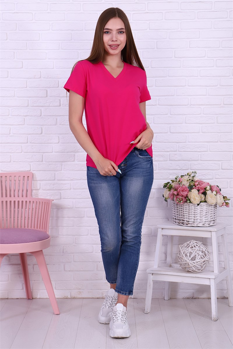 Футболка женская прямого силуэта, с V-образным вырезом и обтачкой, отстроченной отделочной строчкой, рукавом средней длинны. Изделие выполнено из качественного трикотажного полотна ярких летних расцветок. Отлично подойдет под любой Ваш образ!