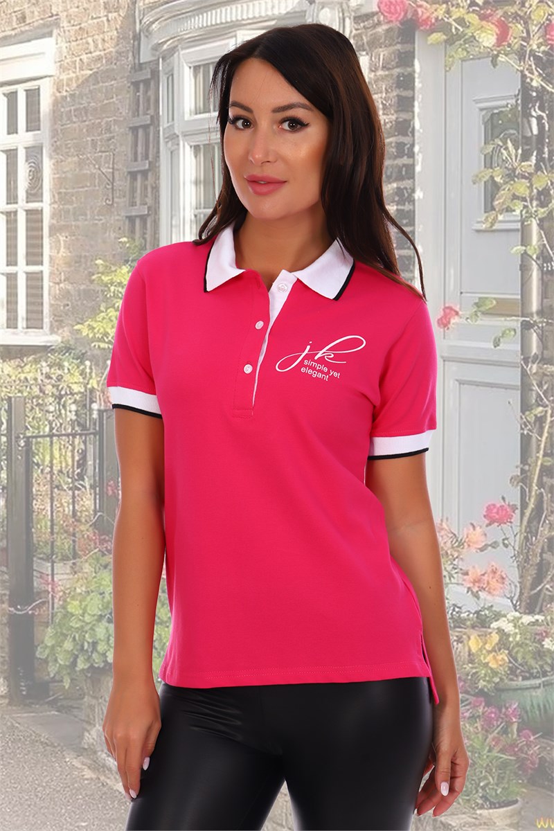 Футболка поло женская для спорта или на каждый день. Ткань лакост-пике с 5% добавления лайкры, благодаря чему изделие не дает усадку и не теряет форму после стирки. Отделка воротника и манжетов в контрастно-белых тонах, на полочке печать, по бокам разрезы