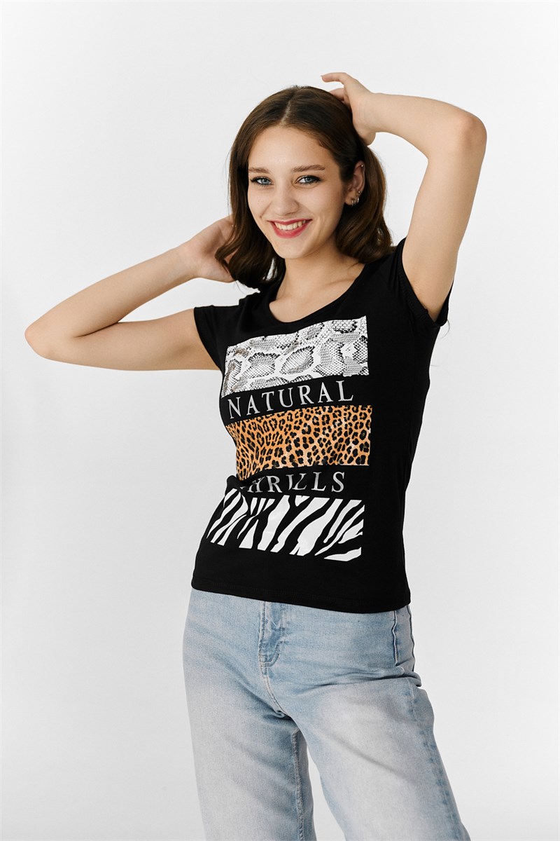 Футболка полуприлегающего силуэта, с округлой горловиной, длиной до середины бедра. Рукав втачной короткий. Горловина обработана бейкой из основного полотна.