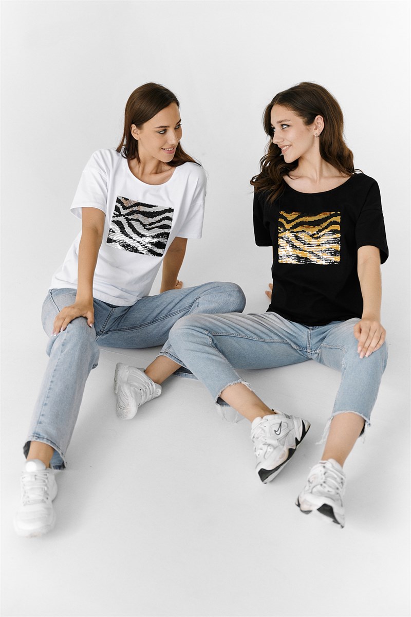 Футболка прямого силуэта, с округлой горловиной спереди и V-образной на спинке, с удлиненной спинкой. Рукав короткий. В верхней части спинки обработан фигурный вырез со шнуром. Горловина обработана бейкой из основного полотна. На полочке эффектная аппликация из пайеток