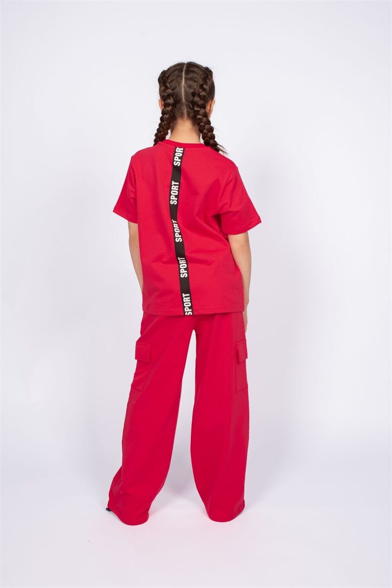 Футболка детская прямого силуэта с втачным коротким рукавом. Горловина круглая, обработана воротником из кашкорсе. Горловина спинки внутри укреплена бейкой из кулирки. Низ изделия и рукава обработан швом вподгибку. На спинке принт Шелкография. Надпись переводится как Спорт.