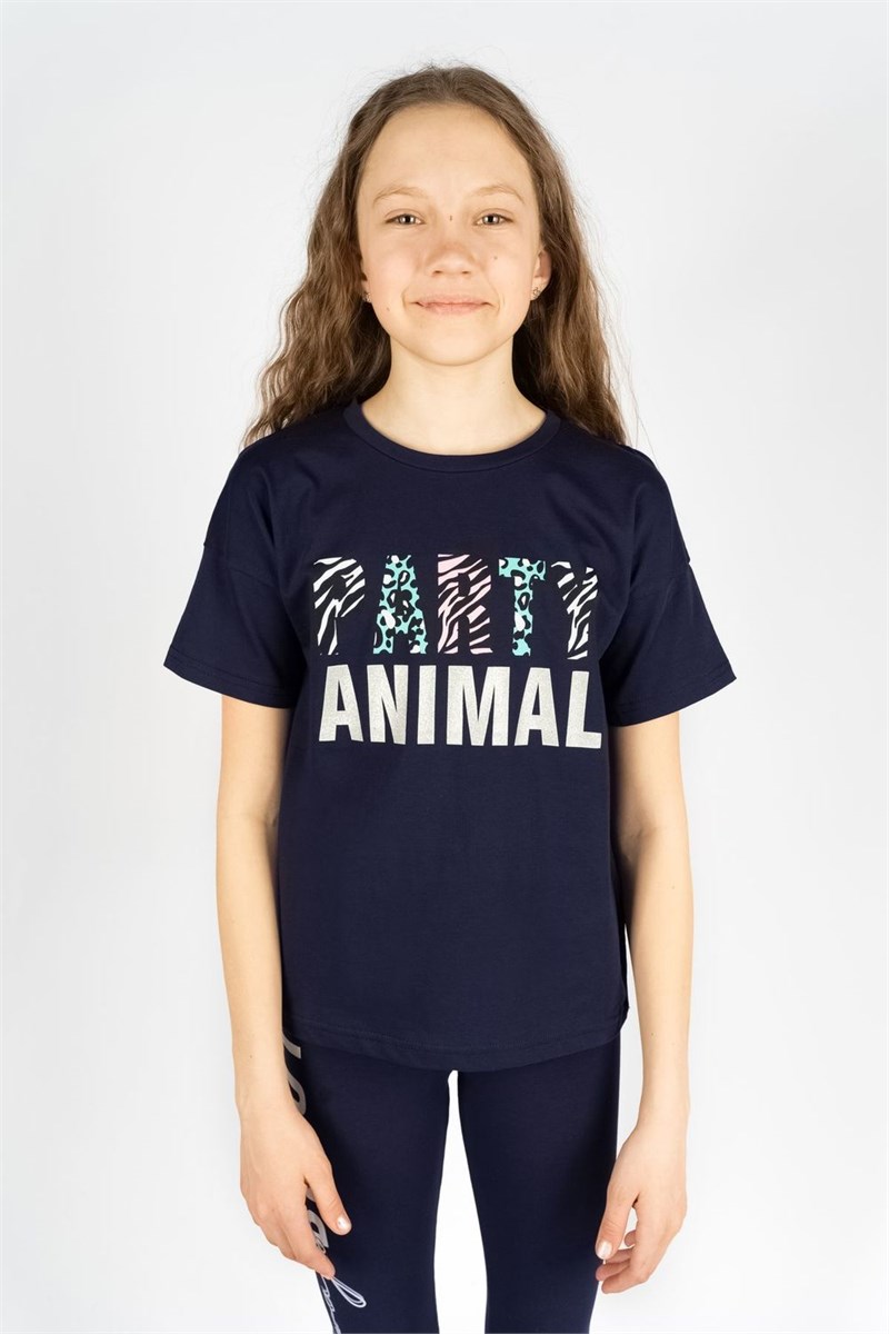Футболка для девочки прямого силуэта со спущенным рукавом. Модный современный принт выполнен в двух цветах для каждой строчки, подчеркивая разностороннюю индивидуальность ребенка и говорит о любви к животным. Мягкий хлопок, из которого изготовлено изделие, позволяет коже дышать и не стесняет движений. Горловина круглая, обработана воротником из кулирки. Низ изделия и рукава обработан швом вподгибку. На полочки принт, шелкография с глиттером.