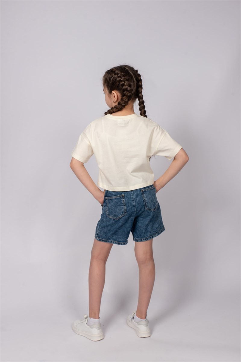 Футболка для девочки укороченная выполнена из 100% хлопка. Футболка прямого силуэта, со спущенным плечом, коротким рукавом. Благодаря эластичной горловине, выполненной из рибаны, футболку удобно снимать и надевать. На полочке принт Шелкография со вспенкой. Материал не растягивается и не деформируется.