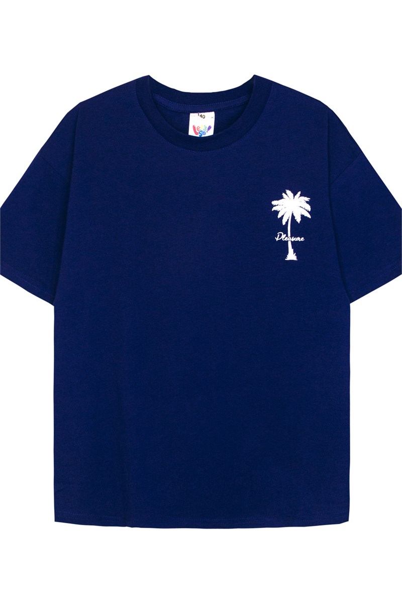 Футболка для мальчика свободного силуэта (оверсайз) с коротким рукавом. Горловина круглая, обработана воротником из рибаны. Горловина спинки внутри укреплена бейкой из кулирки. Низ изделия и рукава обработан швом вподгибку. На полочке принт со вспенкой. Надпись переводится как Удовольствие; Наслаждение.