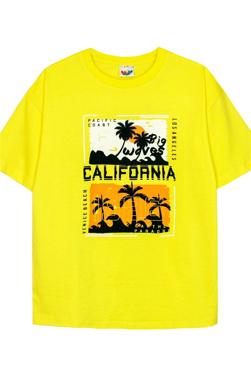 Футболка для мальчика свободного силуэта (оверсайз) с коротким рукавом. Горловина круглая, обработана воротником из рибаны. Горловина спинки внутри укреплена бейкой из кулирки. Низ изделия и рукава обработан швом вподгибку. На полочке принт шелкография. Надпись переводится как Большие волны; Тихоокеанское побережье; Лос-Анджелес; Пляж Венеции; Калифорния.