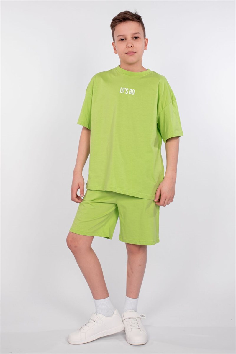 Футболка для мальчика свободного силуэта (оверсайз) с коротким рукавом. Горловина круглая, обработана обтачкой горловиной из рибаны. Низ изделия и рукава обработаны швом вподгибку. На полочке принт Шелкография. Надпись переводится как Вперед.