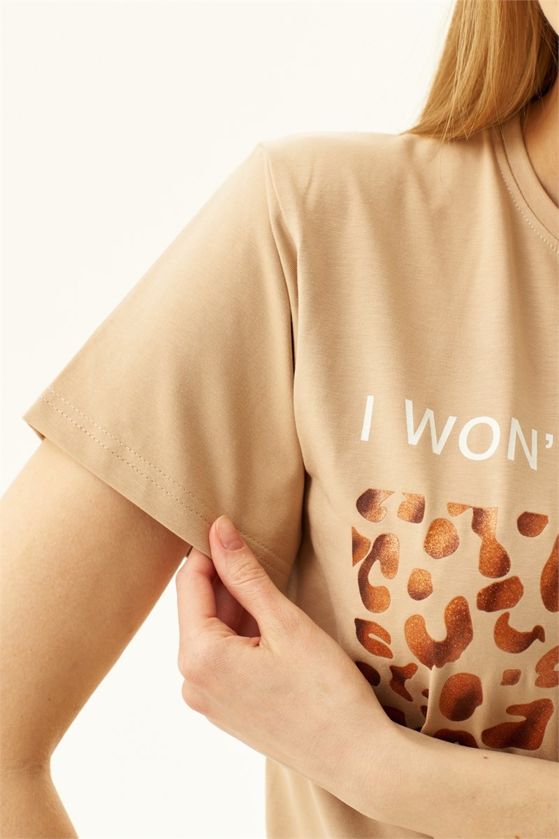 Футболка женская прямого силуэта, длиной до середины бедра. Вырез горловины округлый. Рукав втачной, короткий. Полочку футболки украшает принт.