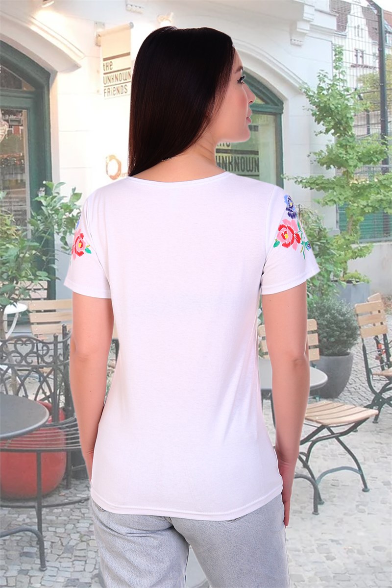 Нежная женская футболка с имитацией вышивки гладью. Широкий размерный ряд. Удобная посадка.