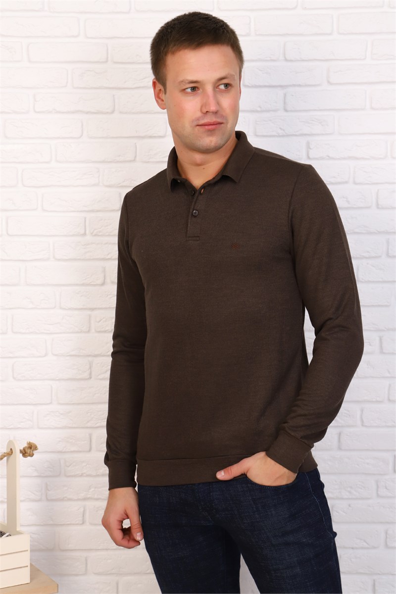 Мужская футболка-поло с длинным рукавом, слегка приталенного силуэта, низ изделия и рукавов на манжете, трикотажный воротник на пуговицах.