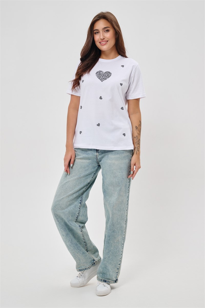 Женская футболка элегантного приталенного кроя с короткими рукавами и классическим круглым вырезом горловины. Минималистичный дизайн дополнен нежными маленькими принтами в форме сердец с леопардовым узором, создающими тонкий акцент на образ. Материал приятен к телу, обеспечивает комфорт и свободу движений. Идеально подойдет для повседневного стиля, подчеркивая женственность и утонченность облика обладательницы.