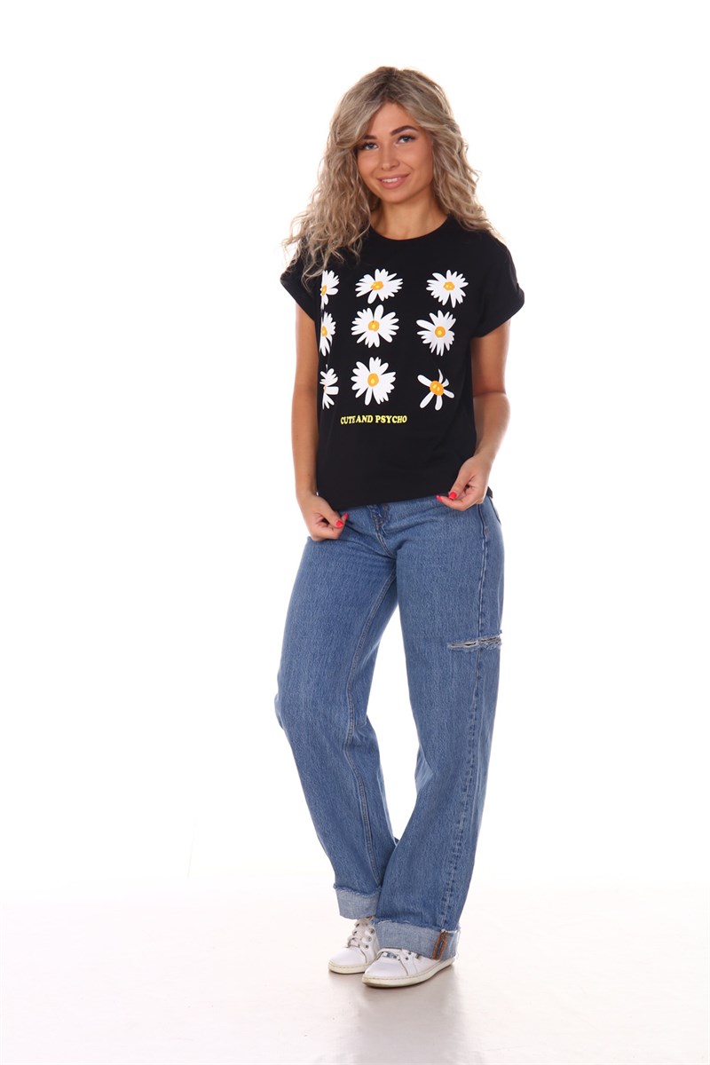 Футболка женская с оригинальным принтом, из хлопковой ткани с лайкрой. Ткань держит форму, не вытягивается, приятная на ощупь. Стильная футболка классического фасона со спущенным рукавом. Посадка свободная. Такая модель подойдет абсолютно всем и станет необходимой вещью в вашем гардеробе.
