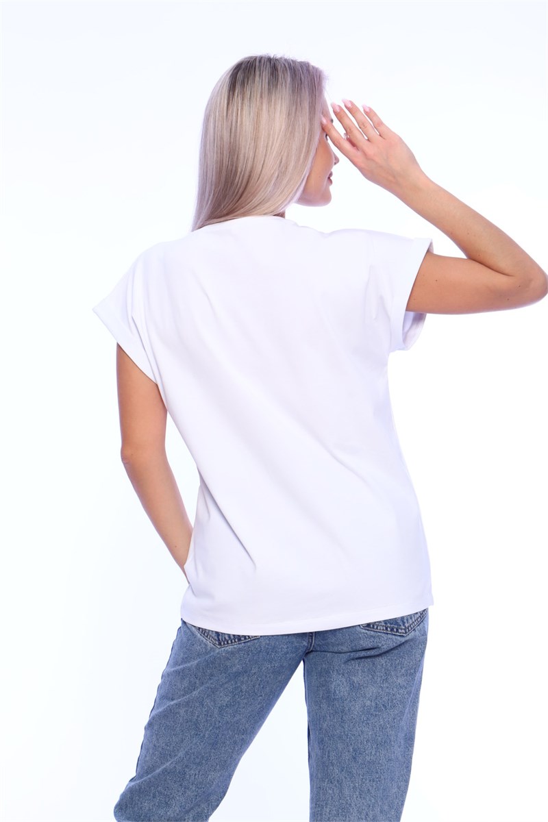 Футболка женская с оригинальным принтом, из хлопковой ткани с лайкрой. Ткань держит форму, не вытягивается, приятная на ощупь. Стильная футболка классического фасона со спущенным рукавом. Посадка свободная. Такая модель подойдет абсолютно всем и станет необходимой вещью в вашем гардеробе.