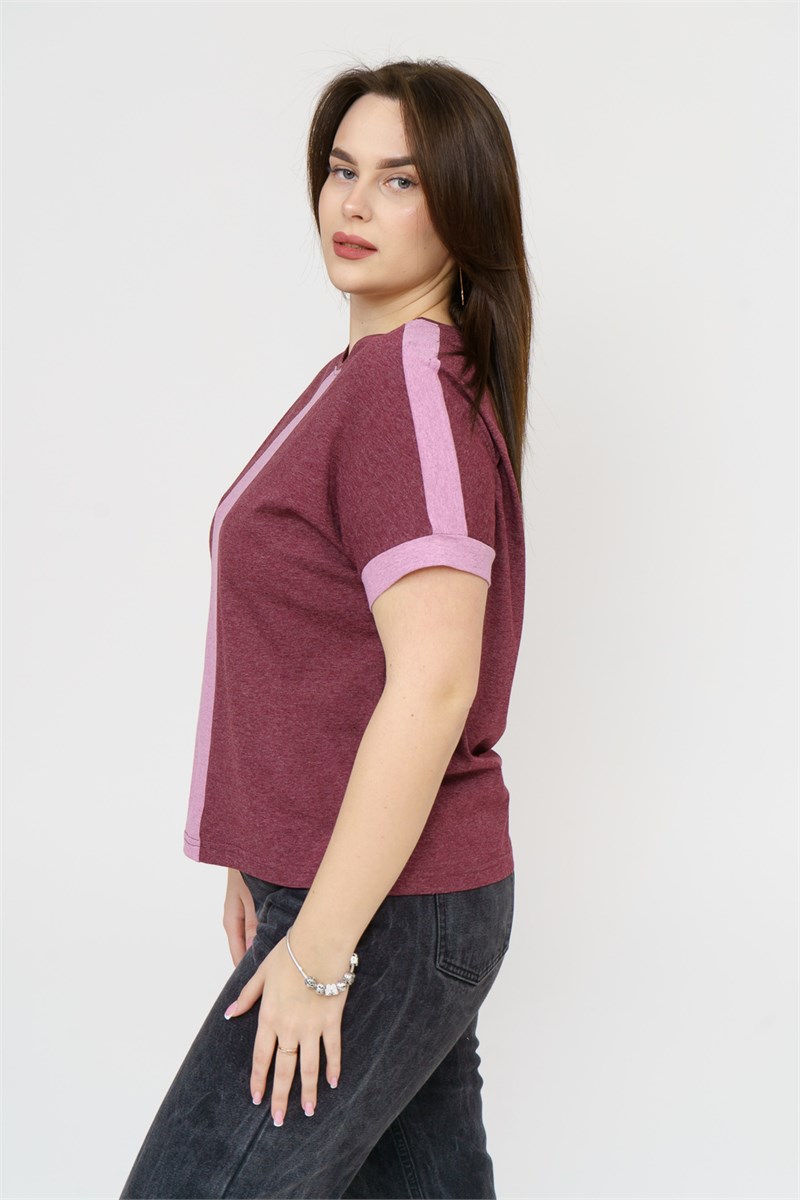 Футболка для женщин, прямого силуэта, укороченная. Вырез горловины округлый. На полочке и плечах изделия контрастная вставка.
