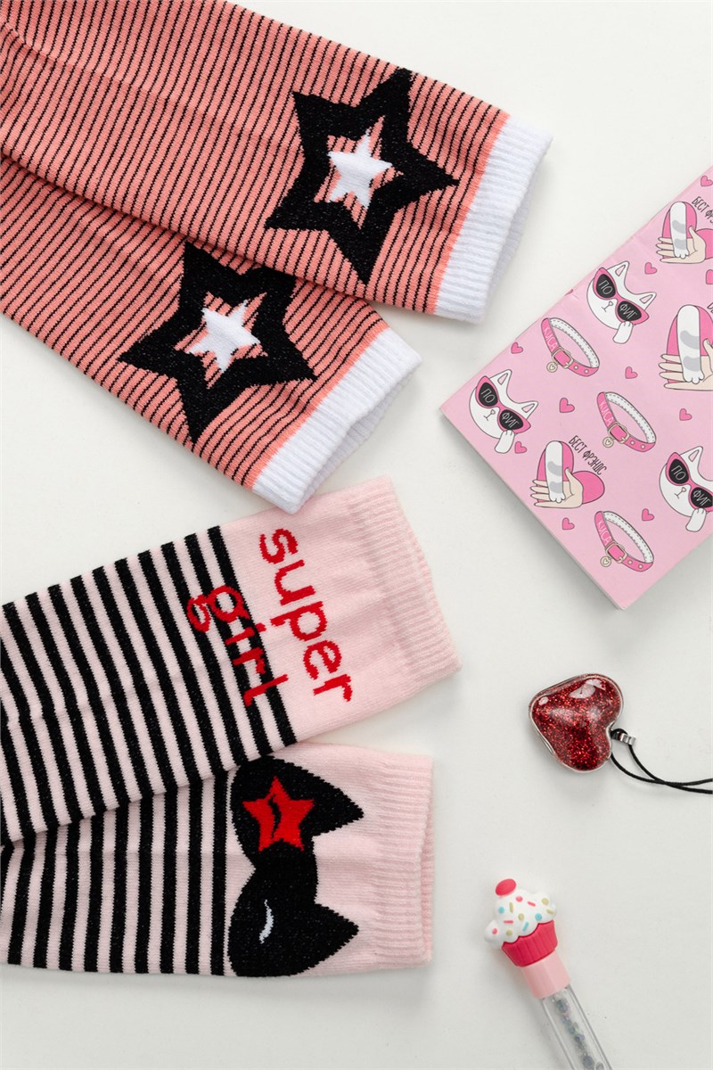Яркие гольфы в полоску для девочек. Одна пара в тонкую полоску, спереди вывязана черная звезда. Вторая пара в широкую полоску, с надписью Super girl и черной маской. В упаковке 2 пары - по одной паре каждого вида.