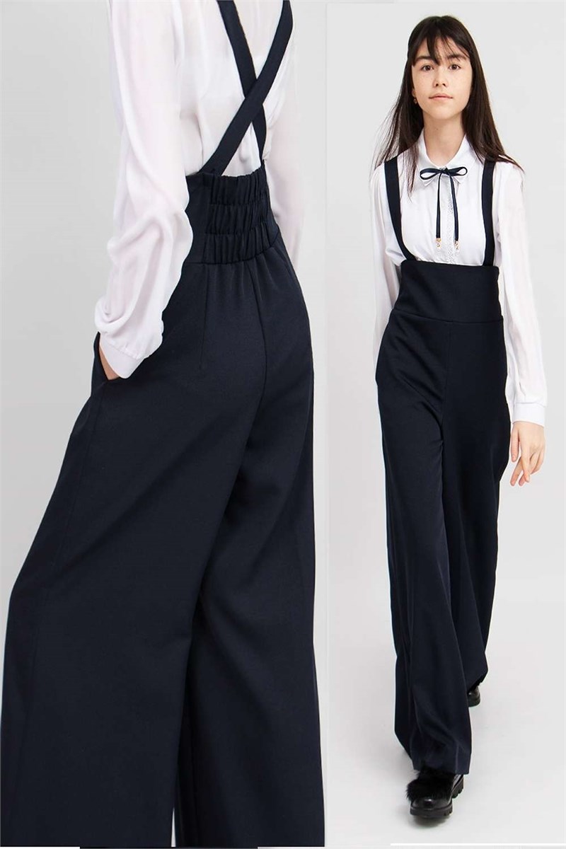 Элегантная юбка - брюки, для девочки. Модель с высокой посадкой, дополнена съёмными бретелями на пуговицах, в пояс вшита резинка. Гармонично сочетается с разнообразными блузками, водолазками и джемперами. Такая вещь непременно подчеркнет индивидуальный стиль юной модницы, и разнообразит ее повседневный школьный образ.