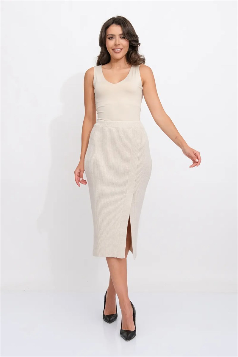 Классическая юбка полуприлегающего силуэта. В пояс горизонтально проложена эластичная резинка. На переднем полотне изделия элегантная шлица.