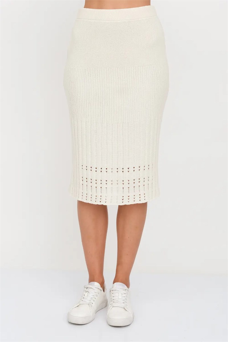 Классическая юбка полуприлегающего силуэта. Переплетение-лапша от узкой по бедрам до широкой с эффектом перфорации по низу изделия . В пояс горизонтально проложена эластичная резинка. Юбку можно носить в комплекте с джемпером И 023, выполненным аналогичным переплетением и узором.