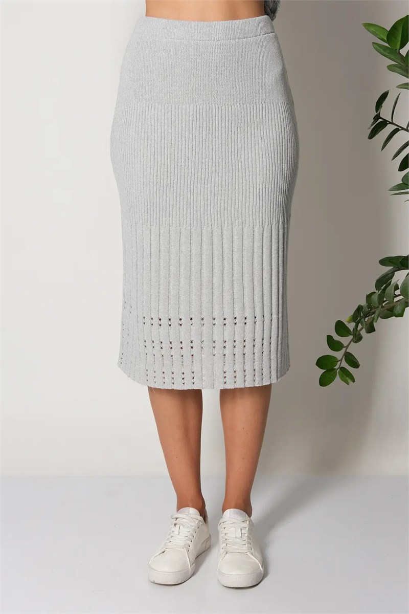 Классическая юбка полуприлегающего силуэта. Переплетение-лапша от узкой по бедрам до широкой с эффектом перфорации по низу изделия . В пояс горизонтально проложена эластичная резинка. Юбку можно носить в комплекте с джемпером И 023, выполненным аналогичным переплетением и узором.