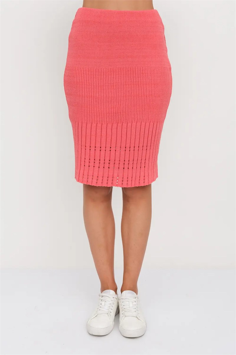 Классическая юбка полуприлегающего силуэта. Переплетение-лапша от узкой по бедрам до широкой с эффектом перфорации по низу изделия . В пояс горизонтально проложена эластичная резинка. Юбку можно носить в комплекте с джемпером И 023, выполненным аналогичным переплетением и узором.