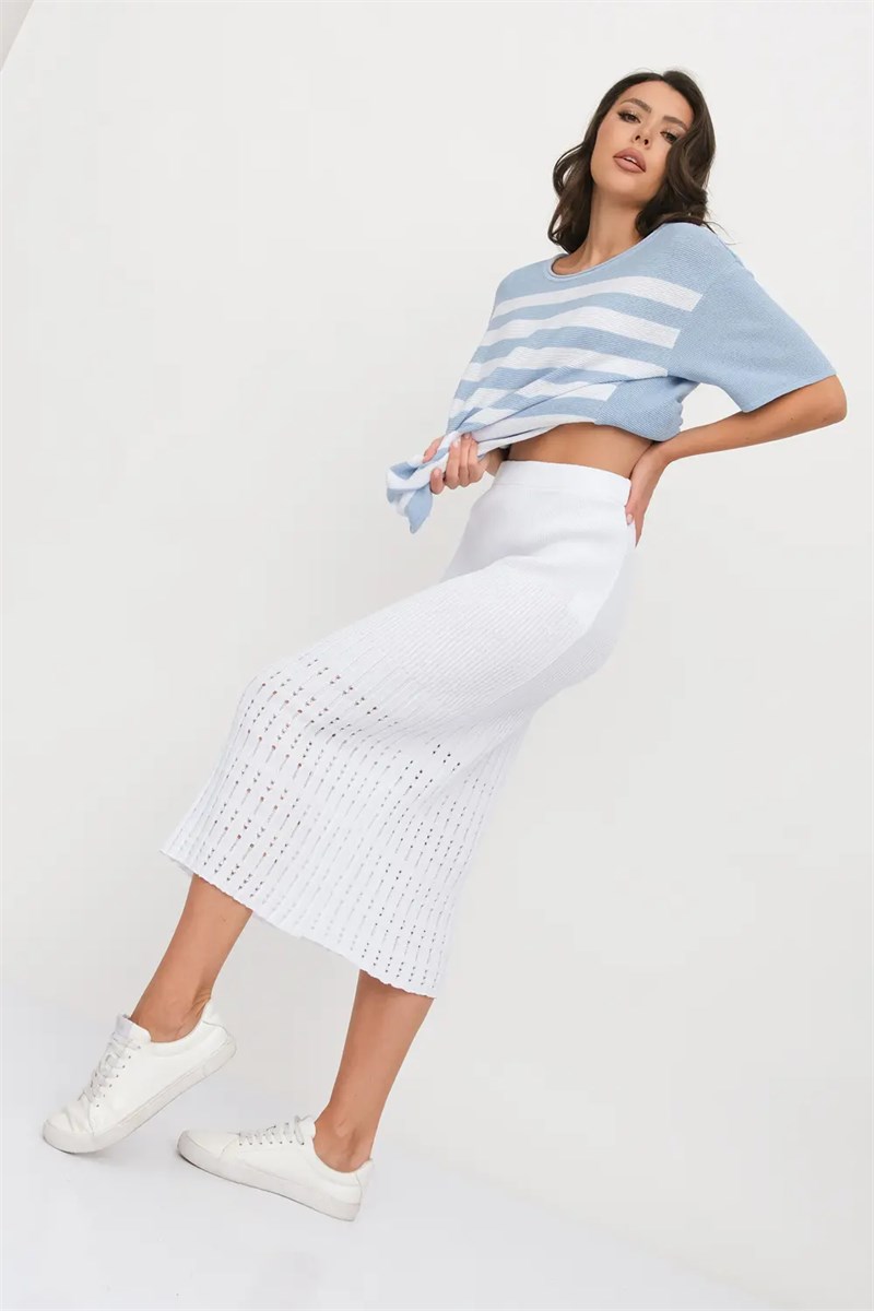 Классическая юбка прилегающего силуэта. Переплетение-лапша от узкой по бедрам до широкой с эффектом перфорации по низу изделия . В пояс горизонтально проложена эластичная резинка. Юбку можно носить в комплекте с джемпером И 023, выполненным аналогичным переплетением и узором.