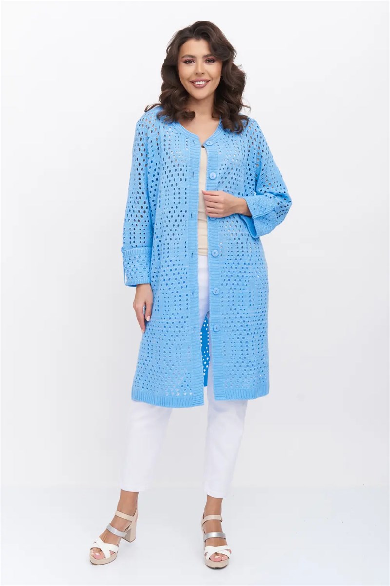 Ажурный кардиган с круглой горловиной, застегивается на крупные пуговицы. Рукава втачные длиной 7/8 с манжетом и патой на пуговице.