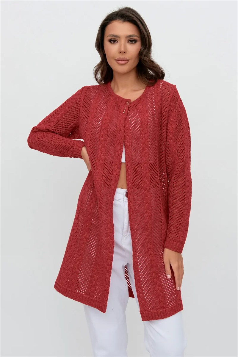 Кардиган женский вязаный, элегантный. В составе 50% хлопка. Ажурный вертикальный узор. Округлая горловина придаёт кардигану выраженную женственность. Рукава втачные, свободные, полной длины. Изделие можно сочетать с брюками и юбками разных фасонов. Декоративные элементы Внимание! Декоративные элементы и фурнитура могут отличаться от заявленного на фото!