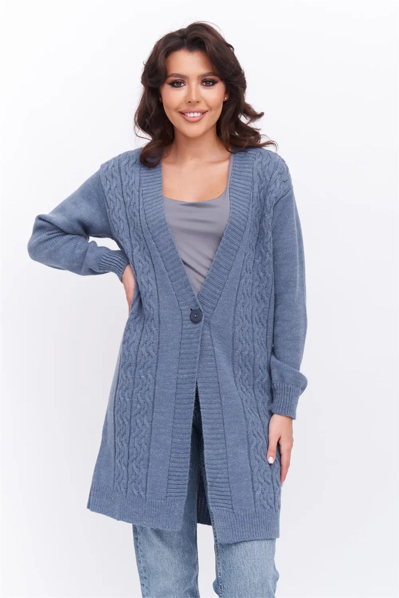Кардиган женский вязаный прямого силуэта. V-вырез, спущеная линия плеча, втачной длинный рукав. Модель имеет застёжку на пуговицу. Полочки выполнены структурным узором "косы". Модель отлично подойдет к платью, юбке и брюкам. Отличное изделие для прохладного времени года для повседневных прогулок на улице или дополняющая деловой стиль на работу в офис или институт.
