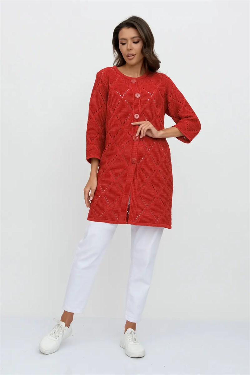 Кардиган женский вязаный, выполнен ажурной вязкой. Состав изделия включает в себя 50% хлопка. Кардиган прямого покроя, застёгивается на пуговицы. Горловина изделия круглая, откетлевана узкой бейкой петля в петлю. Рукава втачные, свободного облегания 7/8. Модель отлично подойдет к платью, юбке и брюкам в качестве верхней одежды летом и для носки в помещении в прохладное время года. Составит нежный и романтичный образ каждой дамы.