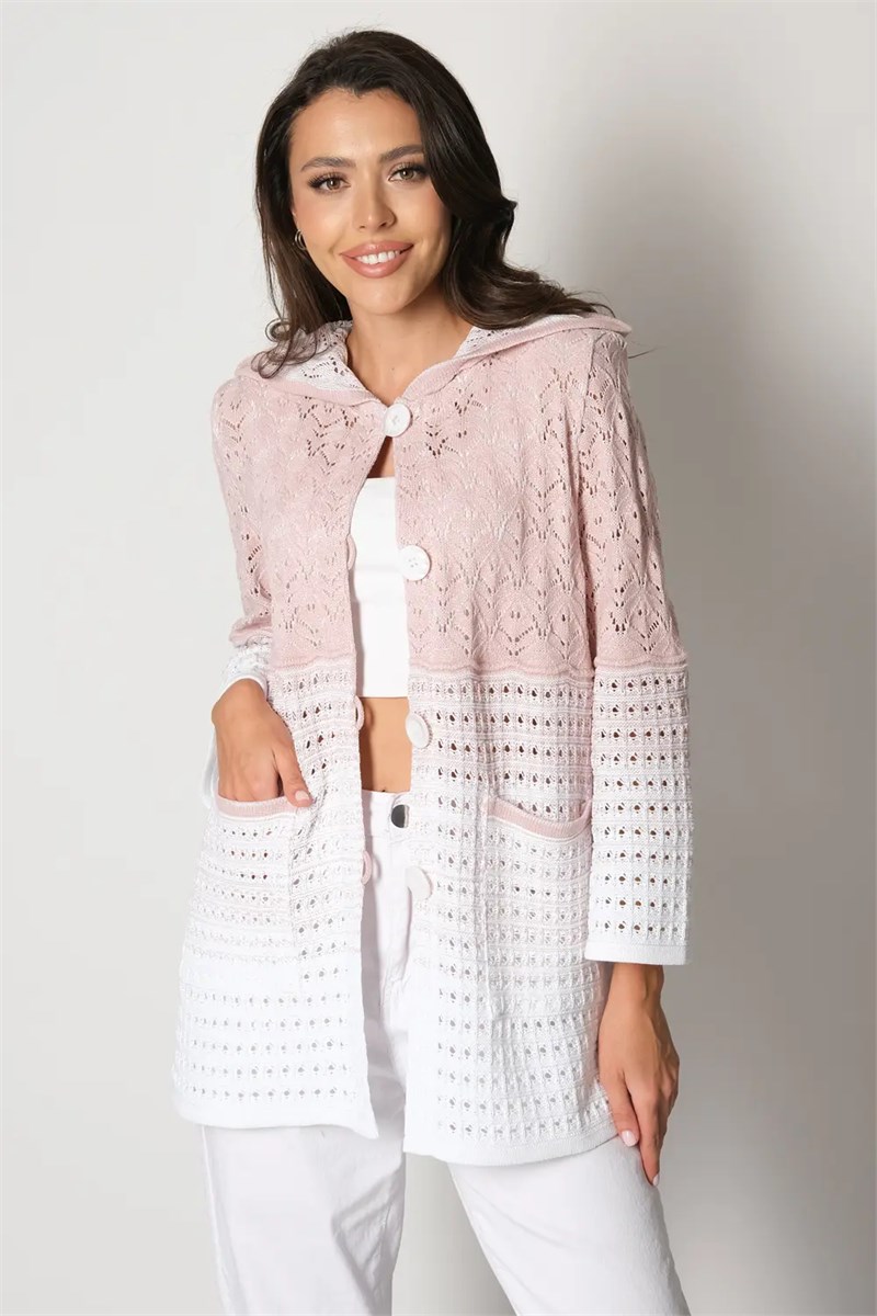 Ажурный удлиненный жакет полуприлегающего силуэта с капюшоном, застегивается на пуговицы. Рукава втачные длинной 7/8, немного расширены к низу. Два накладных кармана. Жакет выполнен ажурным переплетением с переходом цвета от светлого к темному.