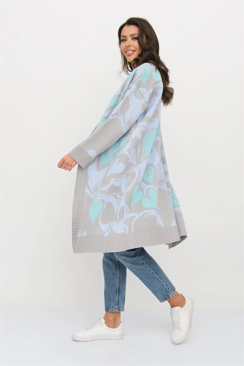 Кардиган женский вязаный свободного силуэта. V-образный вырез. Спущенное плечо, длинный рукав. По низу рукава и изделия эластичная резинка. Кардиган выполнен жаккардовым переплетением с абстрактным рисунком.Стильный кардиган станет незаменимой вещью в Вашем гардеробе, отлично сочетаясь с платьем, юбкой или брюками.