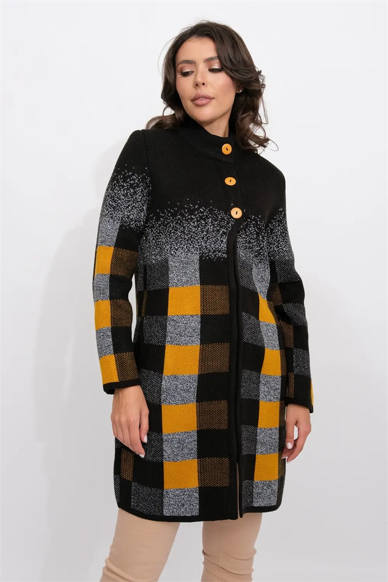 Женский эффектный вязанный кардиган с ассиметричным бортом. Воротник стойка. Кардиган на молнии по всей длине, с декоративными застежками- пуговицами по верху изделия. Рукава втачные длинные. Два прорезных кармана. Жаккардовое переплетение образует геометрический рисунок. Кардиган согреет вас в прохладный день и подарит ощущение невероятного комфорта.