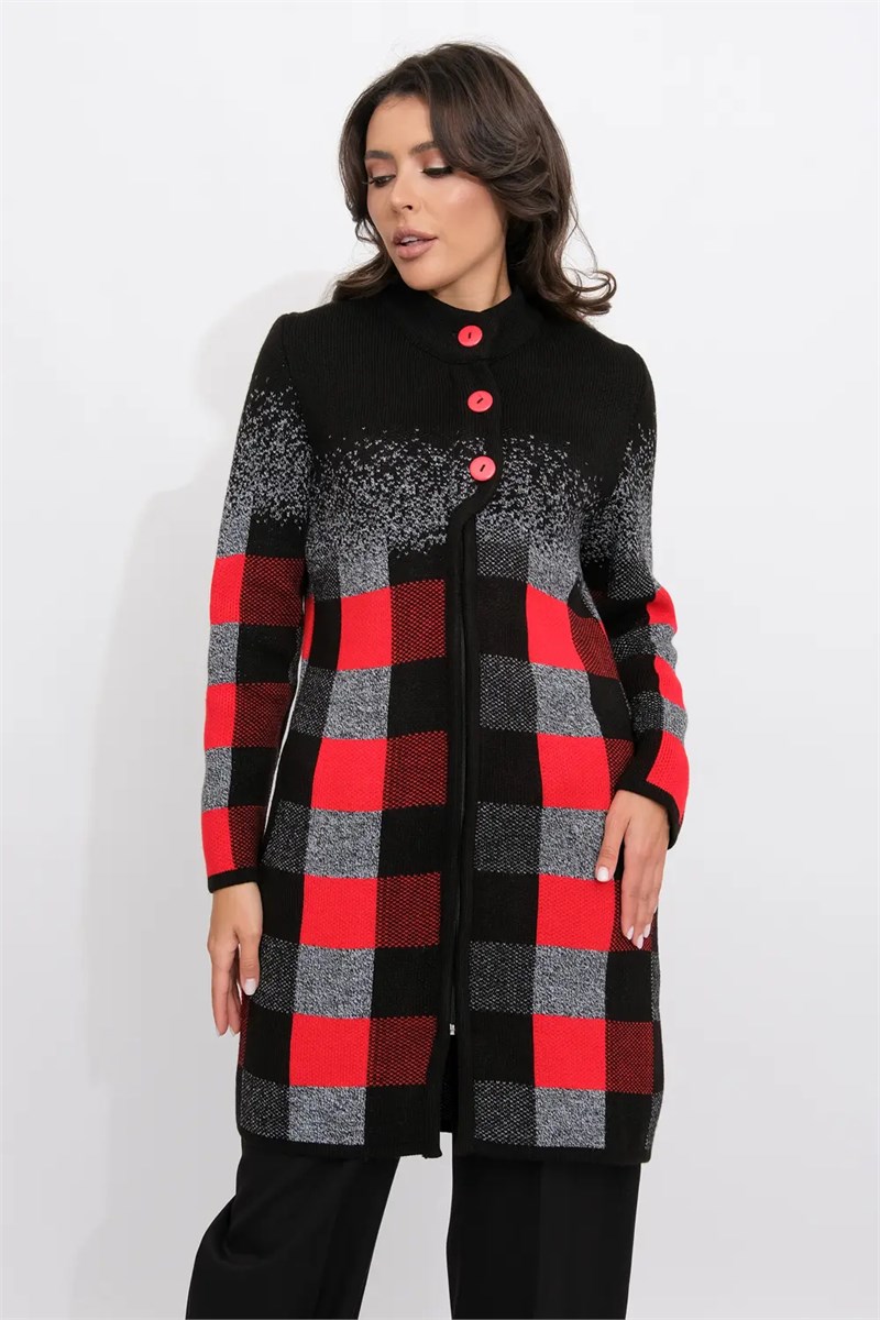 Женский эффектный вязанный кардиган с ассиметричным бортом. Кардиган на молнии по всей длине, с декоративными застежками- пуговицами по верху изделия. Рукава втачные длинные. Два прорезных кармана. Жаккардовое переплетение образует геометрический рисунок. Кардиган согреет вас в прохладный день и подарит ощущение невероятного комфорта.
