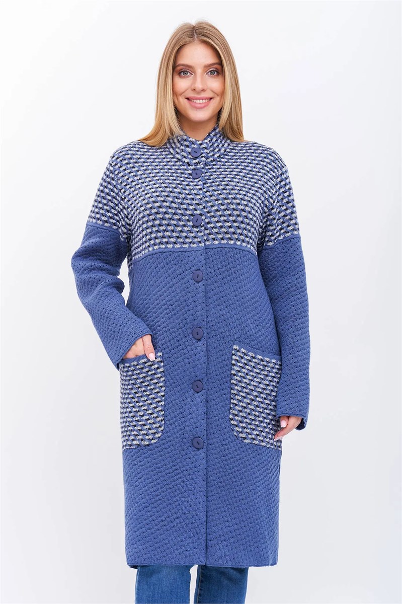 Трикотажный женский кардиган свободного силуэта. Рукава втачные длинные, Кардиган по переду застегивается на пуговицы, воротник-стойка. Два накладных кармана квадратной формы. Изделие выполнено сочетанием жаккардового и структурного переплетений.