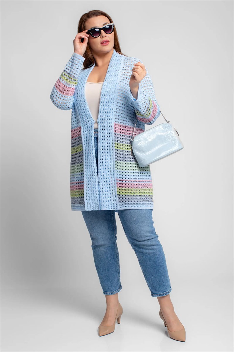 Женский легкий кардиган предназначенный для теплого времени года. Кардиган свободного силуэта с длинным втачным рукавом. По переду проходят отворачивающиеся борта. Небольшая застежка по переду. Кардиган выполнен переплетением "сетка" с цветными переходами.