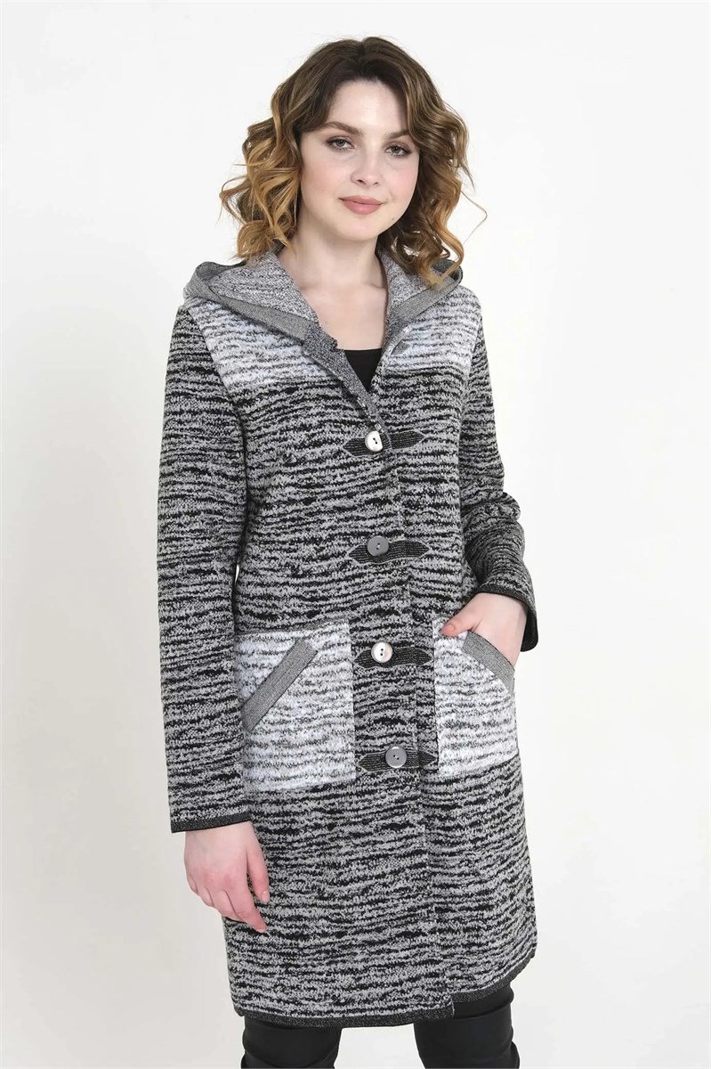 Женский кардиган прямого силуэта с капюшоном. Рукава втачные длинные. Вязаный кардиган на пуговицах, два прорезных кармана с листочкой. Кардиган выполнен жаккардовым переплетением. Кокетка на полочках, караманы и капюшон контрастного цвета