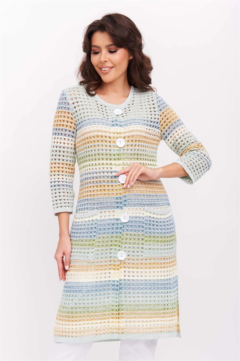 Кардиган женский вязаный, предназначен для тёплого времени года. Свободный прямой силуэт и крупная сеточка придают кардигану оригинальную легкость. А цветовая гамма показывает в изделии романтический стиль. Представлена она светлыми, мягкими тонами и полутонами с нежными переходами от одного цвета в другой. Благодаря такому многоцветию палитра красок подобна радуге после дождя. Горловина кардигана круглая и лёгкая. Небольшие удобные накладные карманы. Застёгивается изделие на крупные пуговицы с помощью воздушных петель. Кардиган можно сочетать с различной одеждой цветных и пастельных тонов. Данная модель является особой новинкой сезона.