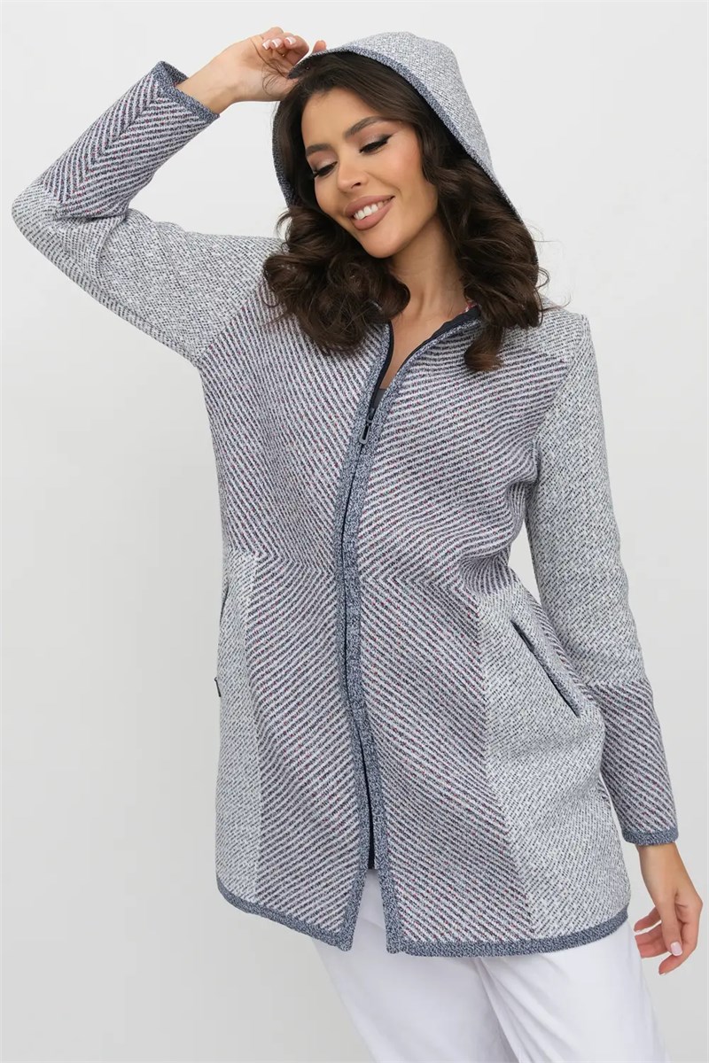 Женский вязаный кардиган полуприлегающего силуэта с капюшоном. Кардиган на молнии. Рукава втачные длинные. Накладные карманы на молнии. Кардиган выполнен жаккардовым переплетением.